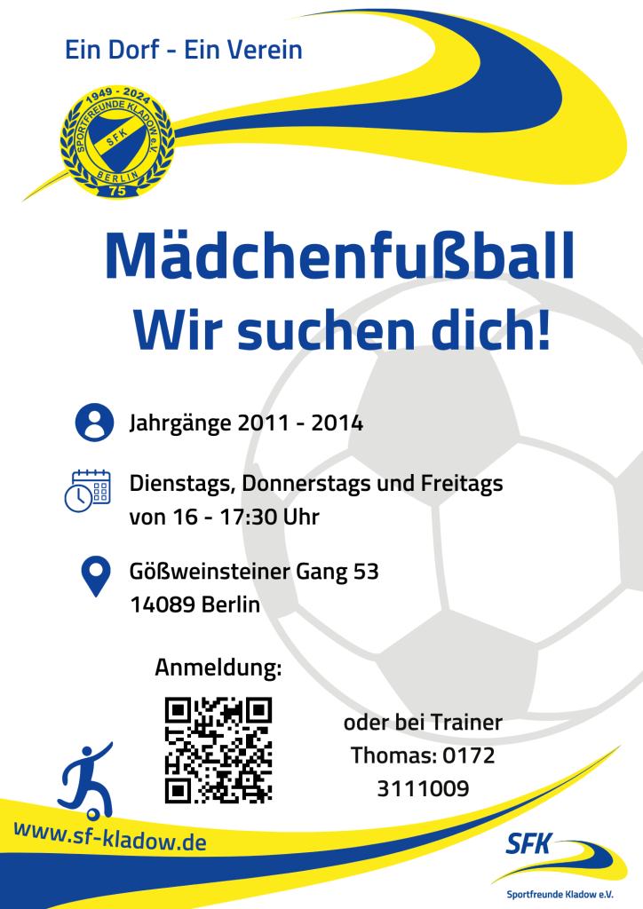 während unser Verein eine lange Tradition im Männerfußball hat, spielt auch der Fußball für die Frauen eine immer größere Rolle. Vor zwei Jahren haben die Sportfreunde eine D-Juniorinnenmannschaft gegründet, die seitdem im Ligabetrieb erste Erfolge feiert. Auch in dieser Saison steht – einen Spieltag vor Saisonende – bereits fest, dass die Kladower Juniorinnen ihre Bezirksliga-Staffel für sich entscheiden konnten (momentan: 7 Siege, ein Unentschieden). Damit die Mannschaft ihr Spielniveau nun auch in der kommenden Spielzeit aufrechterhalten kann, sucht sie nach Verstärkung diverser Jahrgänge:
